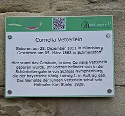König Ludwig I. von Bayern hatte die 15-jährige Cornelia Vetterlein wie die meisten jungen Frauen selbst für seine Schönheitengalerie in der Münchner Residenz ausgewählt. Angeblich lernte der König sie auf einem Spaziergang in München kennen.[4] Der Maler Joseph Karl Stieler, der die allermeisten Porträts für die königliche Schönheitengalerie selbst anfertigte, ist bei Vetterleins Porträt besonders weit von dem neutralen Hintergrund abgewichen,[5] den er sonst wählte, und setzte eine Hügellandschaft mit einer Burgruine ins Bild. Die junge Frau selbst ist kostbar gekleidet, mit einem roten, weit ausgeschnittenen Samtkleid im Renaissancestil, einer prächtigen dreireihigen Halskette, Perlenohrringen und Perlen im aufwendig geflochtenen Haar. In der Hand hält sie dagegen ein bescheidenes Veilchensträußlein.