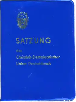 Die Christlich-Demokratische Union Deutschlands[3] (CDU) – kurz auch als Ost-CDU oder auch CDUD bezeichnet – war eine Blockpartei in der DDR. Im Juni 1945 als überkonfessionelle christliche politische Partei in der Sowjetischen Besatzungszone (SBZ) gegründet, hatte sie sich bereits in den ersten Jahren ihres Bestehens der SED unterordnen müssen. Sie ging 1990 in der gesamtdeutschen CDU auf.