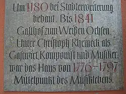 Am 1. Oktober 1794 übernachtete die Familie Wynne auf ihrer Reise vom Schloss Wartegg nach Regensburg in der Wirtschaft „Zum Weissen Ochsen“. Die musikalisch hochbegabte Tochter Elisabeth schreibt: „Der Gastwirt ist ein guter Musikant. Er hat ein ausgezeichnetes Spinett, und ich habe im Sinn, morgen mit ihm etwas Musik zu machen.“ Am 2. Oktober schreibt sie: „Ich spielte Spinett mit dem Gastwirt …“