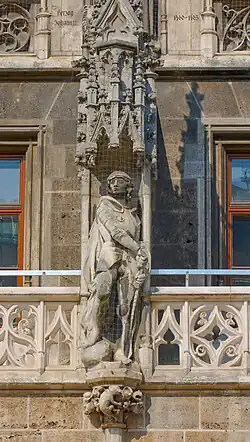 Ein Standbild des Herzogs ist an der Fassade des Neuen Münchner Rathauses am Marienplatz angebracht (1. Obergeschoss, sechste Figur von links).