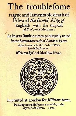 - ↑ The troublesome raigne and lamentable death of Edward the second, King of England: with the tragicall fall of proud Mortimer […] „Imprinted at London for William Jones […]“, 1594.