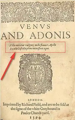 Das am 20. September 1592 erschienene nachgelassene Werk von Robert Greene, „Greene’s Groatsworth of Wit, bought with a million of Repentance“,[41] das angeblich auf Greenes Sterbebett (er starb am 3. September 1592) geschrieben wurde, enthält einen Brief an drei Stückeschreiberkollegen mit verschiedenen ermahnenden Warnungen.