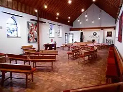 Der Innenraum der Kirche ist weiß gestrichen und mit einer spitzgiebeligen Holzdecke versehen. Nach dem Umbau von 1982 wurde der Altar mittig der westlichen Längsseite aufgestellt, um den sich die Stuhlreihen im Halbkreis formieren, wodurch die Kirche zu einer Querkirche wurde. Im Bereich des vormaligen Altarraums an der Südwand neben dem Osteingang befinden sich in Nischen gesetzt nunmehr nur noch Tabernakel und Taufbecken sowie eine kleine Gebetsnische mit einem Marienbildnis. Hinter dem schlichten Hauptaltar hängt ein deckenhohes einfaches Kreuz, beide aus dunklem Eichenholz, sowie ein modernes Gemälde.