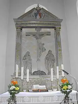 - Der Altar ist eine Schöpfung der Spätrenaissance; er wurde 1599 in Kalkstein gefertigt. Von 1886 bis 1958 ersetzte ihn ein neugotischer Altar mit einem Gemälde der „Bergpredigt“ des Nürnberger Kunstmalers Rall. Der 1958 wieder aufgestellte ursprüngliche Altaraufsatz besteht aus zwei ionischen Pfeilern mit flachem Beschlägwerk, die einen Architrav tragen, der mit einem Dreiecksgiebel mit dem Wappen derer von Absberg und der Jahreszahl „1599“ abschließt. In dem von den Pfeilern gebildeten Feld steht ein Kruzifix mit Maria und Johannes – eine „sehenswerte Kreuzigungsgruppe“.[15] Auf der Predella ist in lateinischer Sprache ein Spruch aus dem 53. Kapitel des Buches Jesaja angebracht.[16]