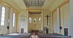 Unter der Leitung des Architekten und Holzbildhauers Richard Oertwig (1908–1944)[1] wurde das Innere der Kirche 1938 grundlegend umgestaltet und renoviert. Das Tonnengewölbe wurde entfernt, Wärmedämmung und Akustik verbessert und der Altarraum neu gestaltet. Dabei wurden die drei dort befindlichen Glasmalereien ausgebaut und die Öffnungen verschlossen. Oertwig fertigte als gelernter Holzbildhauer eigenhändig Altar, Kanzel, Kruzifix, Taufstein wie auch Altar- und Kronleuchter. Von 1973 bis 1975 erhielt der 36 Meter hohe Turm eine neue Kupferblech-Eindeckung und die Kirche einen neuen Anstrich. Von 1998 bis 2000 wurden die Dächer der Kirche, des Pfarrhauses und des Gemeindesaals neu gedeckt. Erst im Rahmen der umfassenden Innen- und Außenrenovierung im Jahr 2009 erfolgte auch der Wiedereinbau der seit 1938 eingelagerten Glasmalereien.