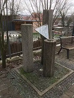 Vor der Kirche steht ein Brunnen, der mit seinen 3 Säulen auf die Dreieinigkeit hinweist. Das Wasser fließt über eine Glasscheibe auf die niedrigste Säule, die hier als Schale ausgebildet wurde. Hier kann auch getauft werden. Der Künstler des Brunnens ist ebenfalls Martin Kiss aus Herrieden.