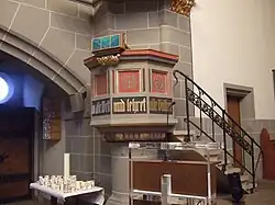 - 4: Kanzel: Sie befindet sich in der linken Seite des Chorraums und ist in der ursprünglichen Gestalt von 1903 erhalten. Jedoch wurde sie während der Renovierung der Kirche 1952 nach Entwürfen des Offenbacher Zeichners Rudolf Koch bemalt. Die Abbildungen zeigen das Kirchenjahr in Symbolen. Der Stern steht für Advent und Weihnachten, die Schlange für die Passionszeit und Ostern, das Jerusalemkreuz für Pfingsten und die drei ineinander gefassten Ringe für die Dreifaltigkeit. Die Inschrift lautet: Gehet hin in alle Welt und lehret alle Völker.