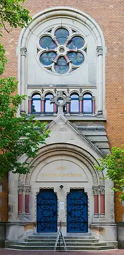 Die Stadt hatte seinerzeit nur den Baugrund der Kirche geschenkt, sodass die Außenanlagen um die Kirche mit dem baumbeschatteten Martin-Luther-Platz noch immer städtisch sind. An der Ostseite der Kirche ragt über dem doppeltürigen Eingang der 36 m hohe neuromanische Kirchturm empor, der Helm ist im Stil romanischer Kaiserdome gestaltet.