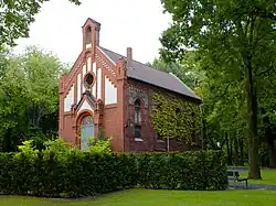 Der Friedhof wurde um 1902 als Friedhof der Christusgemeinde in der Berliner Friedrichstadt angelegt.[2] Ein Jahr später entstanden unter der Leitung von Baumeister Schwencke eine Kapelle sowie die Einfriedung mit dem Eingangsportal. Die im gotischen Stil errichtete Kapelle verfügt über ein Satteldach und wurde wie das Portal aus Backsteinen mit weiß verputzten Rücklagen errichtet. Die Apsis des Saalbaus ist polygonal gebrochen. Der Giebel ist reichhaltig mit Lisenen und Friesen sowie zinnenartigen Ecktürmen verziert. Über dem Eingang befinden sich ein farbiges Mosaik sowie ein goldenes Medaillon mit dem Kopf Jesu Christi sowie den griechischen Buchstaben Alpha und Omega. Eine Skulptur zeigt eine Mutter mit einem Kind. Auf dem Sockel befindet sich die Inschrift „Wie einen seine Mutter tröstet.“[3]