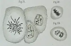 1842 beschrieb der Schweizer Botaniker Carl Wilhelm von Nägeli „transitorische Zytoblasten“ (anfärbbare stäbchenförmige Strukturen im Zellkern von Pflanzenzellen)[5] bei denen es sich vermutlich um Chromosomen handelte. Auch Abbildungen aus den Werken anderer Forscher lassen sich mit heutigem Wissen als Chromosomen bzw. mitotische Zellteilung deuten (Matthias Schleiden 1846, Rudolf Virchow 1857, Otto Bütschli 1873).