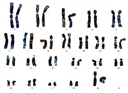 Nomenklatur: Um eine genaue Bezeichnung aller chromosomalen Regionen zu ermöglichen, wurden für den Menschen und einige andere Organismen standardisierte Bezeichnungssysteme eingeführt. Beim Menschen hat jede Bande eine Bezeichnung, die sich aus folgenden Elementen zusammensetzt: Nummer des Chromosoms, p oder q für den jeweiligen Arm (p wie franz. petite für den kurzen Arm; q wie franz. queue für den langen[11]) sowie Zahlen, die vom Centromer aus aufwärts zählen. Zur feineren Unterscheidung können die Zahlen mehrere Stellen haben. Die Bande 3q26.31 ist demnach eine Unterbande von 3q26. Die Bezeichnung „3q“ steht entsprechend für den gesamten langen Arm des Chromosoms 3. Centromerregionen werden auch mit c bezeichnet (3c). Telomerbereiche werden der Einfachheit halber gerne mit tel (etwa 3ptel oder 3qtel) und telomernahe Bereiche mit ter (3pter) bezeichnet. Schematische Darstellungen der Standardbanden heißen Idiogramme. Beispiele sind in der Abbildung rechts und auf der Website von Ensembl[12] zu sehen. In Idiogrammen sind G-Banden stets dunkel, R-Banden weiß eingezeichnet. Bereiche aus repetitiven Elementen werden manchmal schraffiert dargestellt. Eine sortierte Anordnung aller mitotischen Chromosomen aus einer Zelle wird als Karyogramm bezeichnet (Abbildung weiter unten). Der Karyotyp eines Lebewesens gibt an, wie viele und gegebenenfalls welche Chromosomen dieses Individuum hat. Der Karyotyp einer Frau wird als 46,XX angegeben, der eines Mannes als 46,XY (siehe unten, Geschlechtsbestimmung).