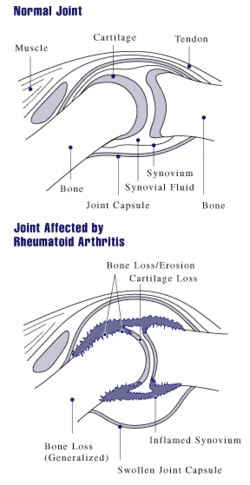 Mittlerweile ist an Mäusen nachgewiesen worden, dass für die RA typische Fibroblasten der Synovia von befallenen Gelenken über den Blutkreislauf in bisher gesunde Gelenke auswandern können. Dies könnte das typische Ausbreitungsmuster der Erkrankung erklären.[15] Der Entzündungsprozess wird jedoch nach Untersuchungen des Zentrums für Rheuma-Pathologie, Mainz, als im Verhältnis zu anderen, ebenfalls immunologisch ausgelösten entzündlichen Gelenkerkrankungen gering eingeschätzt. Obwohl in dieser meist der Grund für die starke Zerstörung des Gelenks gesehen wird, wurde niemals ein Beweis für die Destruktion von Knochen und Knorpel durch eine immunologische Entzündung erbracht.