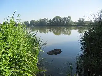 Das Ufer säumen kleine Baumgruppen, hauptsächlich Bastard-Pappeln und Schwarz-Erlen. Die Strauchschicht wird vorwiegend vom Liguster gebildet. Am Wasser wachsen Rohr-, Schilf- und Seggenried-Gesellschaften; hier dominieren der Schmalblättrige Rohrkolben und Schilfrohr. Die Population der (einjährigen) Wassernuss breitet sich normalerweise über mehrere Hektar aus und nimmt 2/3 der Wasseroberfläche ein. In der Mitte des Teiches liegt eine kleine, mit Holunderbüschen bewachsene Insel, auf der die Lachmöwen-Kolonie angesiedelt ist. In der Vergangenheit wurden hier bis zu 5.000 Paare gezählt. Der Teich und seine Umgebung dient auch weiteren 20 Wasservogelarten als Brutgebiet.