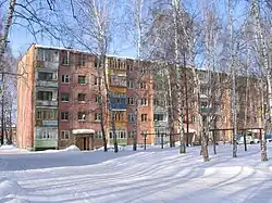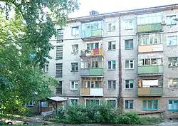 - Das Baumaterial einer Chruschtschowka sind meist Betonfertigteilplatten („Platten“bau im engeren Sinne), manchmal aber auch Ziegel, – in letzterem Fall sind der Wohnkomfort und die Nutzungsdauer des Gebäudes geringfügig höher als dies bei Betonbauten im Allgemeinen der Fall ist;
