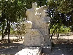 - Chulda-Denkmal: Es handelt sich um eine Steinskulptur des Bildhauers Batya Lishansky[20] aus dem Jahre 1937, die an Efraim Chisik, seine Schwester Sara und andere erinnert, die in den kriegerischen Auseinandersetzungen, die Israels Staatswerdung begleiteten, getötet wurden. Efraim Chisik kam 1929 bei den Kämpfen um Chulda ums Leben (siehe oben), seine Schwester bereits neun Jahre zuvor bei den Kämpfen um Tel Chai.
