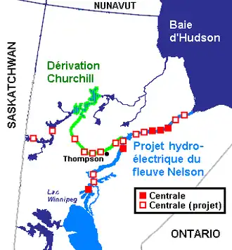| Ableitung von etwa 70 % des Wassers zum Nelson River | ||