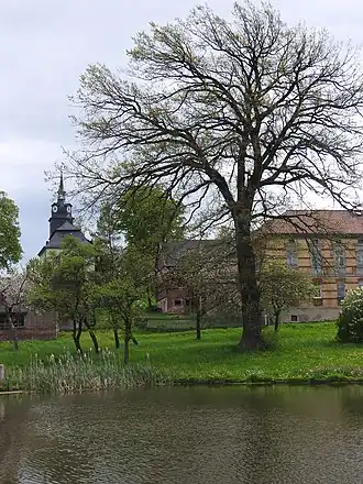 Die Dorfkirche mit Rokokomalereien stammt aus dem Jahre 1770. Eine Besonderheit ist das geschmückte Gestühl mit künstlerisch nummerierten Plätzen und die Trampel-Orgel aus dem Jahr 1753.[3][4]