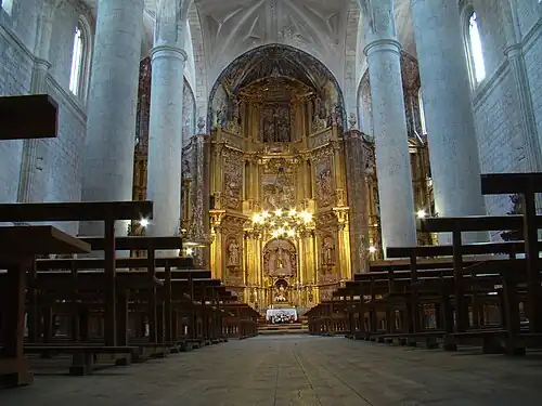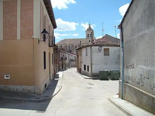 - Die zweitürmige Iglesia de Santiago ist dem Apostel Jakobus d. Ä. geweiht und wurde in mehreren Bauabschnitten in den Jahren zwischen 1535 und 1772 erbaut. Die schmucklose Westfassade stammt von Rodrigo Gil de Hontañón; das Südportal ist dagegen weitaus stärker gegliedert. Die drei Schiffe (naves) der Hallenkirche sind durch gemauerte Säulen voneinander getrennt; die drei Apsiden sind gleich hoch und gleich tief. Die Mittelapsis zeigt ein klassizistisch-barockes Altarretabel mit einer zentralen Reiterfigur von Santiago Matamoros; die seitlichen Figuren von Petrus und Paulus stammen aus den Händen des Bildhauers Gregorio Fernández. Mehrere kleinere Altäre schmücken die Seitenschiffwände; beachtenswert sind die schmiedeeiserne Kanzel und ein klassizistisches Taufbecken.[7]