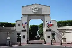 An einer zentralen Wegkreuzung des Friedhofs steht das Denkmal für die Toten des Ersten Weltkrieges. Das 1923 vom Architekt Henri Bertin und dem Bildhauer Yroudy errichtete Monument zeigt als Hauptfigurengruppe eine Frau umgeben von vier Soldaten. Die Frau als Symbol für die Mutter und Ehefrau ist als Trauernde mit gesenktem Kopf dargestellt, während ein sterbender Soldat zu ihr aufschaut. Am Sockel findet sich die Figur eines Arbeiters, der als Friedenssymbol ein Schwert zerbricht. Diese antimilitaristische Figur führte in den 1920er Jahren zu erheblichen Kontroversen. 1926 wurde die Figur mutwillig beschädigt und danach nicht wieder rekonstruiert.[2] Des Weiteren gibt es ein Grabfeld mit 29 Gräbern britischer Soldaten, das von der Commonwealth War Graves Commission betreut wird.[3] Zudem erinnert ein Monument an die Pariser Taxifahrer, die 1914 zur Verstärkung Soldaten an die Front gefahren haben. In Levallois-Perret waren seinerzeit zahlreiche Pariser Taxiunternehmen mit ihren Werkstätten ansässig. Auch an die im Krieg gestorbenen Angestellten der örtlichen Automobilindustrie erinnert ein Gedenkstein.[4]