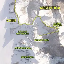 In einem Protokoll vom 1. Oktober 1898 einigten sich der chilenische Experte Diego Barros Arana und der argentinische Experte Francisco Pascasio Moreno auf die Festlegung der Grenze im Bereich des südlichen patagonischen Eisfeldes, die anhand der folgenden Gebirgsmarken und ihrer natürlichen Kontinuität bestimmt wurde: Fitz Roy, Torre, Huemul, Campana, Agassiz, Heim, Mayo und Stokes.[7][8][9] Der Circo de los Altares liegt westlich der von den beiden Sachverständigen definierten Linie und gilt somit als chilenisches Gebiet im Sinne dieser Linie.
