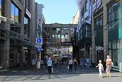 | Die beiden Einkaufszentren, dazwischen eine historische Heuer-Ampel | ||