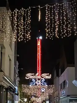 In der Adventszeit wird der im Dunkeln rot angestrahlte City Skyliner auch als „höchste Kerze der Welt“ vermarktet.