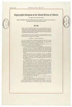 Der Civil Rights Act of 1964 ist ein US-amerikanisches Bürgerrechtsgesetz, das Diskriminierung aufgrund von Rasse, Hautfarbe, Religion, Geschlecht oder nationaler Herkunft verbietet. Entscheidend war, dass das Gesetz das Bundesjustizministerium bevollmächtigte, das Gesetz durchzusetzen, da die Bundesstaaten dies nach dem Erlass der vorherigen Bürgerrechtsgesetze von 1957 und 1960 nicht oder nur zögerlich getan hatten.