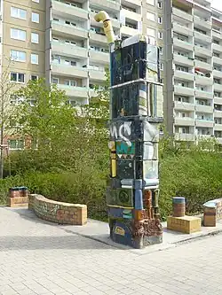 - Im nördlichen Bereich des Platzes befindet sich seit 1985 eine Sitzlandschaft, dessen auffälligstes Element eine skurrile 4,50 Meter hohe Skulptur ist. Sie wirkt wie aus Schrottteilen zusammengefügt, besteht aber aus farbig glasierten Klinkersteinen und regt die Fantasie des Betrachters gehörig an. Daneben sind Sitzelemente aus gelben Ziegelsteinen aufgemauert. Der Komplex entstand nach Plänen von Wolfgang Weber und Horst Göhler und wurde bereits 1985 hier aufgestellt. Im Jahr 2007 erfolgte eine umfassende Sanierung.[7]