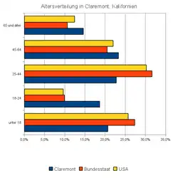20,7 % der Einwohner Claremonts waren unter 18 Jahre alt, 18,6 % zwischen 18 und 24, 22,8 % zwischen 25 und 44, 23,3 % waren zwischen 45 und 64 sowie 14,6 % 65 Jahre und älter. Das Medianalter betrug 35,8 Jahre (Kalifornien: 33,3[5]; USA: 35,3 Jahre[6]).