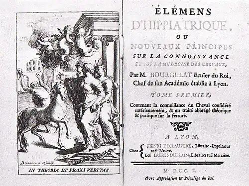 Bourgelats Biograf Marc Mammerickx sieht bereits in dem an eine Unterrichtssituation angelehnten dialogischen Frage- und Antwortstil der Elémens d’hippiatrique erste Ansätze für Bourgelats Plan, eine eigens auf den Unterricht in Tiermedizin spezialisierte Schule zu gründen.[20] Erste Pläne zur Schaffung einer solchen Einrichtung hatte Bourgelat bereits ab 1750 in Lyon verfolgt, diese waren schließlich aber am Widerstand der dortigen Stadtverwaltung gescheitert. Gleichwohl war ein geregelter veterinärmedizinischer Unterricht für ganz Frankreich von wirtschaftlichem und militärischem Interesse. Vier Jahre vor Ende des Siebenjährigen Kriegs hatte Henri-Léonard Bertin das Amt des französischen Generalkontrolleurs der Finanzen übernommen. Er förderte die Ideen Bourgelats, weil er der Bekämpfung von Tierseuchen in der Rinder- und Pferdehaltung eine hohe ökonomische und zugleich – wie im Falle der für den Kriegseinsatz benötigten Pferde – politische Dimension beimaß. Insbesondere die Rinderpest führte im Europa des 18. Jahrhunderts zu großen Verlusten.