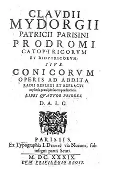 - Claude Mydorge: Prodromi catoptricorum et dioptricorum sive Conicorum operis ad abdita radii reflexi et refracti mysteria praevij et facem praeferentis. Isaac Dedin, 1639 (Latein, beic.it).