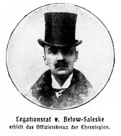 1913 wurde von Below-Saleske als Nachfolger von Hans von Flotow Gesandter in Belgien und war dort bis zum Ausbruch des Ersten Weltkrieges 1914 tätig.[4]