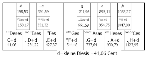 Dabei bedeutet ,x (Tiefkomma x) und 'x (Hochkomma x): x um ein syntonisches Komma erniedrigt bzw. erhöht.