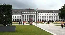 Clemens Wenzeslaus hielt einen prächtigen Hof und ließ in Koblenz ein kostspieliges Schloss erbauen, wohin er 1786 seine Residenz von dem baufällig gewordenen Schloss Philippsburg unterhalb Ehrenbreitsteins verlegte. Besonders die Musik wurde an seinem Hof gepflegt, auch ließ er ein öffentliches Theater, das heutige Theater Koblenz, errichten. Es wurde am 23. November 1787, dem Namenstag des Kurfürsten, mit Mozarts Oper Entführung aus dem Serail eingeweiht.[2] Angesichts der hohen Kosten, die der Bau des Schlosses verursachte, fand Clemens Wenzeslaus im Finanzberater seiner Schwester Kunigunde, dem Hofrat Franz-Joseph Schmitz, einen privaten Finanzier für das Theater. Als Gegenleistung erhielt Schmitz den Titel des ersten Direktors des „Comoedien-, Opern-, Ball-, und Assembléehauses“ und wurde von Steuerzahlungen befreit.[3] Prinzessin Kunigunde war regierende Fürstäbtissin des Stiftes Essen und Reichsstiftes Thorn, lebte aber zumeist in Koblenz am Hof ihres Bruders.