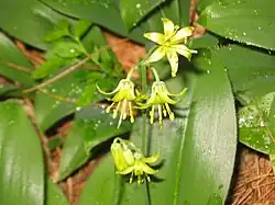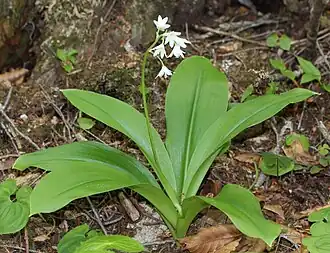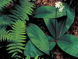 Habitus, Laubblätter und Blütenstand von Clintonia udensis | ||||||||||||