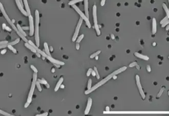 Flavonifractor plautii REM-Aufnahme. 5.000 fache Vergrößerung, Maßstab = 10 μm. | ||||||||||||