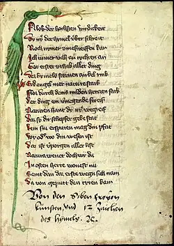 - ↑ Die Angaben in diesem Abschnitt folgen, wenn nicht anders vermerkt, der Beschreibung von Karin Zimmermann: Cod. Pal. germ. 14. In: Die Codices Palatini germanici in der Universitätsbibliothek Heidelberg (Cod. Pal. germ. 1–181). Wiesbaden 2003, S. 38 (Digitalisat; abgerufen am 22. März 2020).