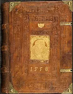 Auf dem Vorderdeckel findet sich eine vergoldete Platte mit dem Bildnis Ottheinrichs in einer Kartusche, in der oben das Namenskürzel O.H. (Ottheinrich) vermerkt ist und unten das Titelkürzel P.C. (Pfalzgraf, Churfürst). Oberhalb der Kartusche steht ein goldgeprägter Engelskopf, unterhalb die ebenfalls vergoldete Jahreszahl der Anfertigung des Einbands: 1558. Auf der gleichartig vergoldeten Platte auf dem Hinterdeckel steht in einer Kartusche das Wappen der Pfalz.