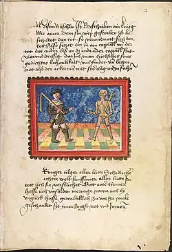- ↑ Zimmermann/Effinger: Codex Palatinus germanicus 76: Johannes von Tepl – 'Der Ackermann aus Böhmen' (Abschnitt Die Bilder von Ackermann und Tod), Webpräsenz UB-Heidelberg, 09/2008; abgerufen am 11. April 2020.
