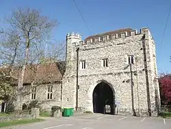 Das Torhaus des Colleges im Norden des Geländes ist ein dreigeschossiger rechteckiger Turm mit einem zweigeschossigen Torhaus mit Kreuzrippen-Gewölbe. Der Durchgang ist 2,7 m (8 ft 11 in) breit und hat nebenan einen Fußgängerdurchlass mit einer Breite von 1,2 m (4 ft).[14] Der Raum im Erdgeschoss neben dem Durchgang war die Bäckerei, wo bis 1845 ein großer Bäckerofen gestanden hat. Der Raum westlich des Durchgangs war die Pförtnerwohnung.[15] Das Dach des Turms hat ein Walmdach, welches auch einen überdachten Wehrgang überspannt. Ein kleines Türmchen steht an der Südwest-Ecke. Anschließend an den Turm steht das zweigeschossige Gebäude, dass das eigentliche College mit Refektorium, Küche und Spülküche (scullery) im Erdgeschoss und einem Schlafsaal und einer Krankenstation im ersten Stock. Poste verzeichnet, dass um 1845 verschiedene Räume und Anbauten und landwirtschaftliche Gebäude entfernt wurden, unter anderem einen Darre (oast house).[16] In der Nordwest-Ecke des Gebäudes steht ein kleiner dreigeschossiger Turm, der so genannte "River Tower" oder Muniment Tower (Schutzturm).[14] 1847 wurde das Hochgezogene Dach durch ein niedrigeres Dach ersetzt, das den Wehrgang nicht mehr überragt.[16]