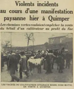 - ↑ L’Excelsior vom 2. Februar 1936; Violents incidents au cours d’une manifestation paysanne hier à Quimper auf Gallica