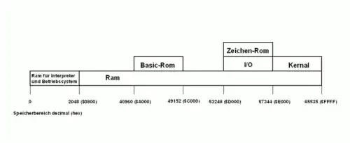 Der C64 verfügt über 64 KB dynamischen RAM. Davon sind 38911 Bytes für BASIC-Programme nutzbar. Die Größe des Speichers war für die damalige Zeit üppig (der zwei Jahre ältere Vorgänger VC 20 hat nur 5 KB Arbeitsspeicher, wovon für die Programmiersprache BASIC 3584 Byte nutzbar sind). Die Speicherstellen 0 und 1 sind nicht direkt von der CPU ansprechbar, hier befindet sich der Prozessorport des 6510; mittelbar unter Zuhilfenahme des Grafikchips VIC II können die Speicherstellen jedoch gelesen und beschrieben werden.[8] Zusätzlich zu den 64 KB dynamischen RAM gibt es noch 1024 Nibbles statischen Farb-RAM, insgesamt verfügt der C64 also über 64,5 KB RAM.[9]