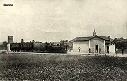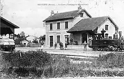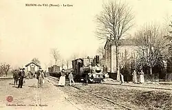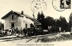 Bahnhofsgebäude mit einem militärischen Pferdekrankenwagen des 6e Corps und einem Wachhäuschen, 1916. Erhalten unter der Verwaltung von Conseil Départemental de la Meuse. |