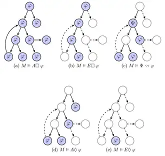 CTL Formeln werden über Transitionssysteme definiert. Für eine gegebene Folge von Zuständen des Systems (beginnend in Zustand ) sind die Operatoren formal wie folgt definiert, dabei steht für erfüllt :