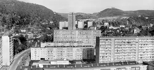 Nachdem Suhl 1952 nach Auflösung der Länder in der DDR Bezirkshauptstadt geworden und bis zur Wiedervereinigung 1990 geblieben war, wurden große Teile des historisch gewachsenen Stadtkerns abgerissen und unter Federführung der Bauakademie der DDR unter Hermann Henselmann sozialistisch umgestaltet. Dabei entstand ein neues Stadtzentrum mit Kulturhaus, Stadthalle mit angeschlossenem Hochhaus, sechs weiteren Hochhäusern mit 14 Etagen, einer vierspurigen Schnellstraße, dem Centrum Warenhaus und Verwaltungsgebäuden.