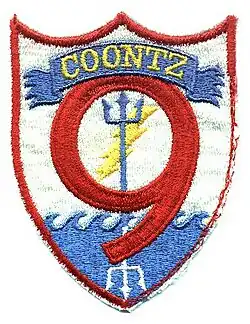 Durch die Reklassifizierung und die damit einhergehende Änderung von Kennung und Kennnummer besaß die Coontz über die Jahre zwei verschiedene Insignien. Zu Beginn, zu Zeiten, als die Coontz DLG-9 war, bestand das Wappen aus einer großen Neun (die natürlich die Kennnummer repräsentierte). Etwa unter dem Ende des Kringels der Neun ist eine wellige Wasseroberfläche zu sehen. Sowohl über als auch unter der Wasseroberfläche befindet sich, jeweils ein von der Oberfläche wegzeigender Dreizack, die Waffe des Meeresgottes Poseidon, der die Fähigkeiten des Schiffes in U-Jagd und Luftabwehr symbolisieren soll. Die Lenkwaffen werden durch einen Blitz angezeigt, der hinter dem oberen Dreizack zuckt. Über der Neun prangt der Schriftzug Coontz.