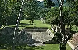 Der Spielplatz von Copán für das mesoamerikanische Ballspiel ist nach der Anlage in Chichén Itzá der zweitgrößte, der je im Gebiet der Maya entdeckt wurde. Er liegt in der freien Fläche, die die beiden Hälften der Hauptgruppe trennt. Sein Spielfeld wird von zwei aus Tuffstein errichteten Böschungen so eingegrenzt, dass es ungefähr die Form des römischen Buchstaben „I“ einnimmt. An jede Böschung grenzt etwas erhöht je ein Gebäude an, das möglicherweise als Aufenthaltsraum für Zuschauer gedacht war.[5] Entlang der Längsachse des Spielfeldes sind drei steinerne Markiersteine in den Boden eingelassen.