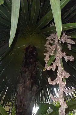 Der Blütenstand ist mindestens 1,8 Meter lang und reicht über die Blattkrone hinaus. Die Blüten sind bräunlich-gelb und zwittrig. Die Früchte sind bei einem Durchmesser von etwa 1,2 Zentimetern rund und schwarz.