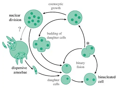 Der Lebenszyklus von Corallochytrium schließt mit der Freisetzung von limaxförmigen (nacktschneckenförmigen) Sporen (englisch dispersal amoebae, Verbreitungs- oder Streuamöben) ab.[4][13]