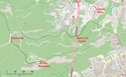 Der Ausgangspunkt der Bahn befindet sich in einer Höhe von 40 m. ü. M. Bei einer mittleren Neigung von 167 ‰ fährt die Bahn die 3824 m lange Strecke in 25 Minuten auf 670 m Höhe. Der steilste Abschnitt weist bis zu 300 ‰ auf. Bergauf wird mit maximal 15, bergab mit 12 km/h gefahren. Die Zahnradbahn durchquert bei der Fahrt zum Gipfel des Corcovado den im Jahre 1961 eröffneten Nationalpark des 40 km² umfassenden Tijuca-Regenwaldes.